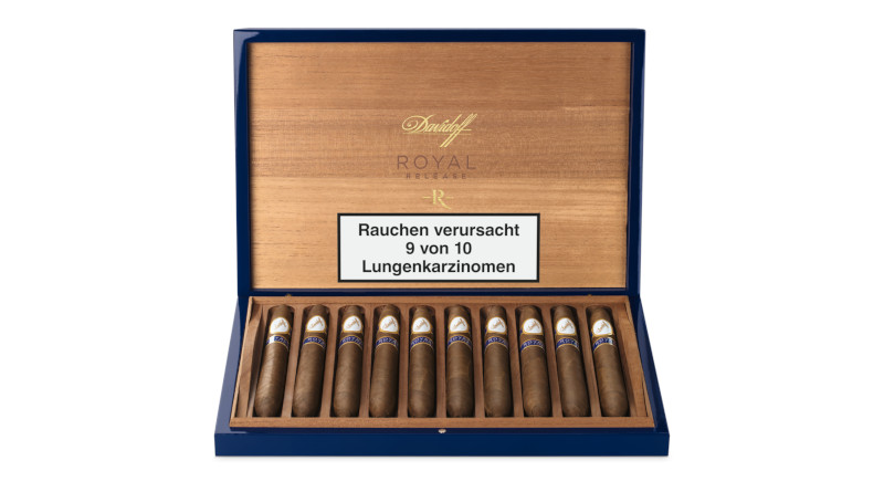 An der ‚Royal Release‘ ist alles handverlesen – von der Aussaat bis zum letzten Zug erfolgt ihre Herstellung in 170 sorgfältig überwachten Arbeitsschritten. Das Saatgut wurde speziell für diese Cigarre entwickelt und gepflanzt. Die Tabakballen reifen acht Jahre, bevor sie von Rollern mit mindestens 15 Jahren Erfahrung gerollt werden. Der Blend – erhältlich als Robusto und Salomones – besteht aus einem dominikanischen Deckblatt, einem ecuadorianischen Umblatt und gut gereiften dominikanischen Einlagetabaken. Die ‚Royal Release‘ bietet ein Geschmackserlebnis mit würzigen Noten, die sich mit gerösteten Mandeln und Leder vermischen. Der Geschmack der Cigarre spiegelt sich auch im Design der eleganten Holzkiste wider. Sie ist in passendem Königsblau mit goldenen Elementen lackiert.