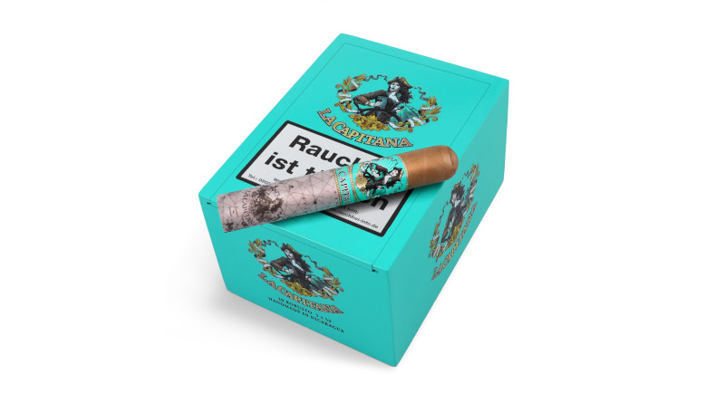 Wer nun den Drang verspürt, die ‚La Capitana‘ probieren zu wollen, hat die Möglichkeit, aus zwei Formaten zu wählen. Während in den USA die Formate ‚Lonsdale‘, Robusto (5×50), Toro (6×50) und Churchill (7×48) debütierten, beginnen in Europa das Robusto- und das Churchill-Format. Am Kopf der Cigarre ist das seidig-matte Deckblatt direkt zu erkennen. Danach übernimmt der türkisfarbene Ring mit der Kapitänin das Ruder. Ein bedrucktes Seidenpapier verhüllt den Rest der Cigarre und verleiht ihr so ihr perfektes Äußeres. Eine Landkarte mit Schiffsrouten über den Atlantik erzählt die aufregende Geschichte der ‚La Capitana‘.