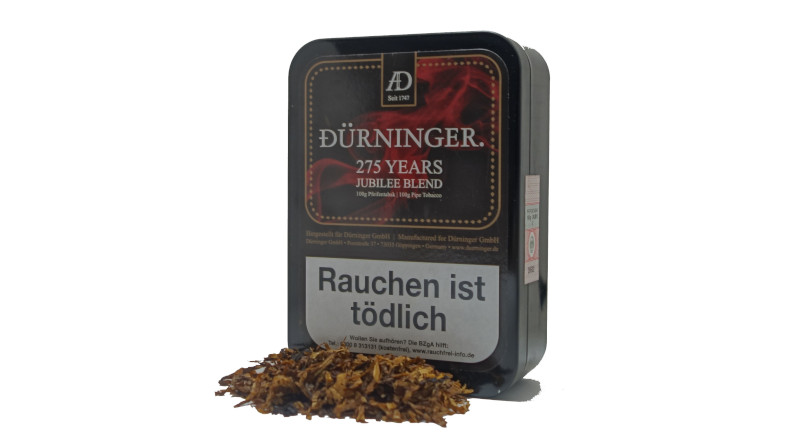 Der ‚Dürninger 275 Jahre Jubiläumstabak‘ ist ein Masterblend mit einer fruchtigen Mischung aus Virginia, Black Cavendish und Burley und besticht durch eine mild-mittelwürzige Mischung mit dem Aroma vollreifer Pflaumen und einem Hauch Vanille.